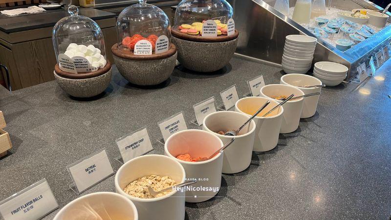 果汁的選擇有芭樂汁、橙汁和綜合水果汁。牛乳製品方面,有乳酪、可以配上芭樂粒或菠蘿粒,也有鮮奶、低脂牛奶可以喝!麥片有好多選擇,也備有不少配料和鮮奶可以加入麥片!