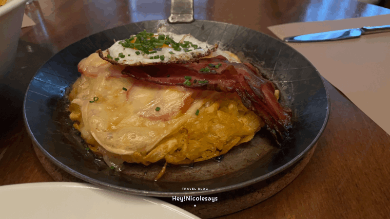這是瑞士傳統的薯餅,薯絲煎成薄餅的模樣,上面的配菜有煙肉、芝士、和煎雞蛋,加上調味,成為了惹味的瑞士薯餅。