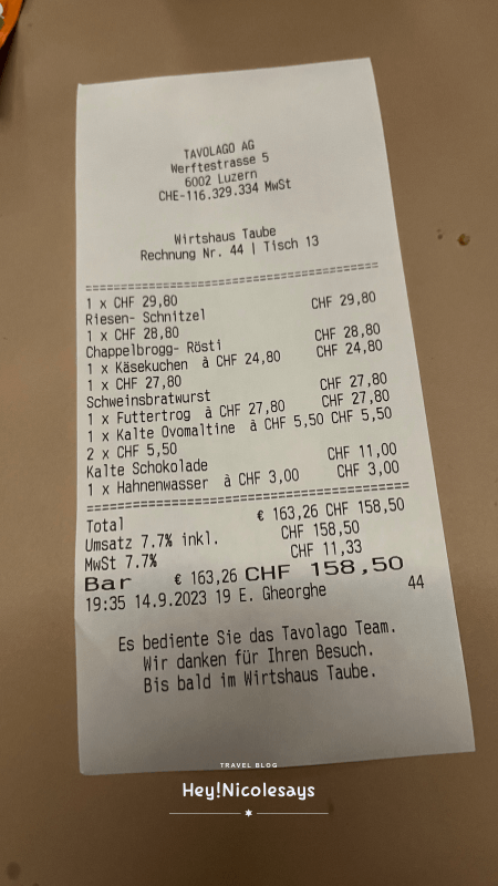 ▼ 瑞士的物價偏貴,但價格也有點像香港在餐廳吃晚飯的價錢(除了那3杯飲品),所以對我們來說覺得還是可以接受的範圍。我們4個人點了5款餐點,3杯飲品,這一餐總花費價格: CHF158.5,可以參考一下。