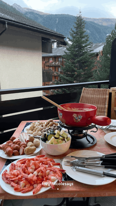 ▼ 這個小露台,也是我們第一晚享用芝士火鍋的地方,氣氛真的超好!一邊望著瑞士的山景,呼吸著清新的空氣,一邊吃著道地的瑞士芝士火鍋,這種幸福感,簡直無法用言語形容!之前有朋友問我為什麼不拍 Vlog,現在不是比寫部落格更受歡迎嗎?但對我來說,一心實在難以二用。如果忙著拍攝影片,可能就沒辦法完全放鬆、好好享受當下的悠閒了。所以,我還是選擇用自己最舒服的方式,記錄這些美好時刻。
