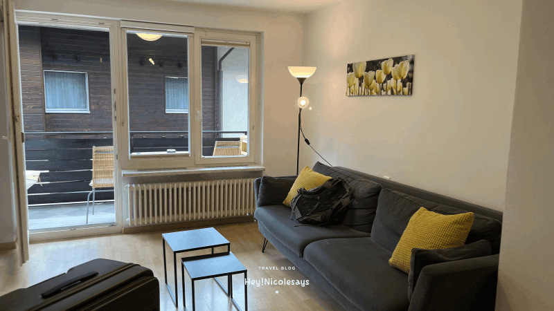 ▼ 客廳設有落地大玻璃門與大窗,連接一個小露台,採光非常充足,整體空間明亮通透。房間內沒有冷氣,但備有暖氣設備。由於策馬特海拔較高,氣溫比市區低不少,因此即使是九月中旬到訪,也完全不需要使用冷氣,晚上甚至還頗為涼爽,相當舒適。