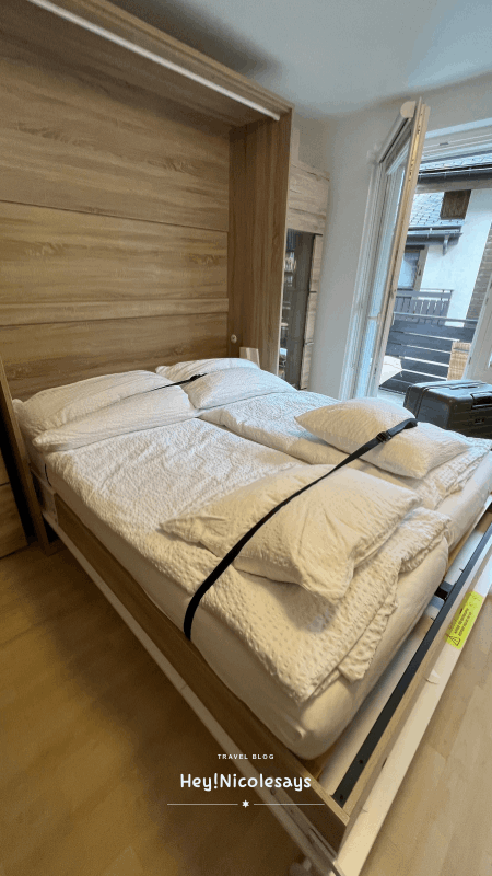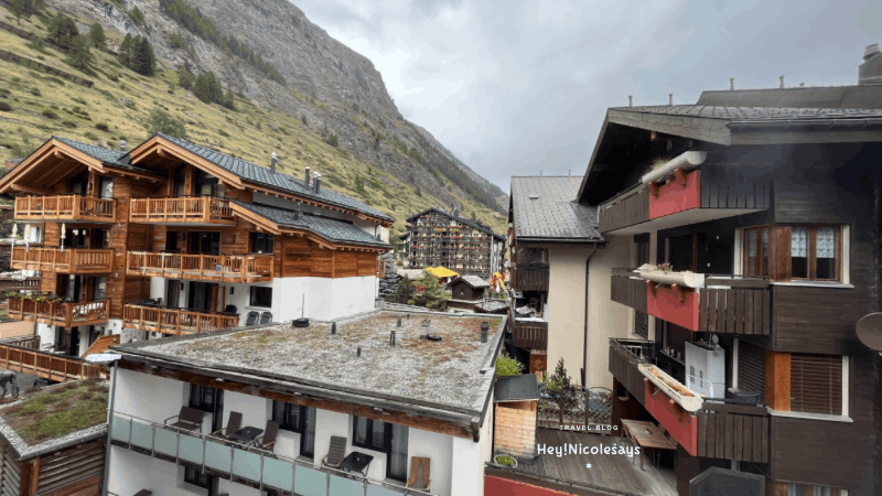 ▼ 雖然小露台的視野不算非常開闊,但整體環境舒適,已經相當令人滿意。畢竟,面對梅特峰或馬特洪峰景色的四人房,價格幾乎都是天價,而且很多還得睡在梳化床上,實在讓人下不了手。於是我們選擇更勤勞一點:早早起床,走到附近的橋上欣賞馬特洪峰的日出。這樣不僅省下了高昂的住宿費,還多了一份旅途中的儀式感,真的很值得!