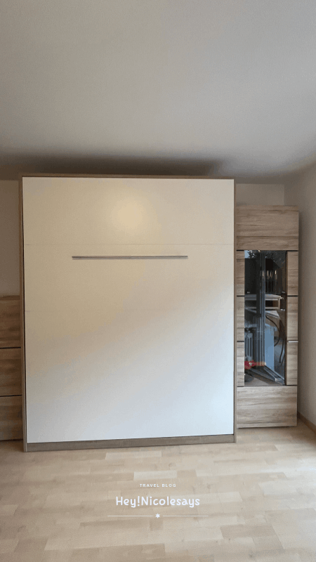 ▼ 客廳的櫃子裡巧妙隱藏了一張 Murphy Bed(隱壁床),只要將櫃門向下拉開,就會變成一張正常尺寸的雙人床——注意,它不是一般的梳化床,而是實實在在的標準床鋪。不過,與睡房的床一樣,這張隱壁床的床褥偏軟,承托力稍為不足,如果習慣偏硬床墊的話,可能需要一點時間適應。