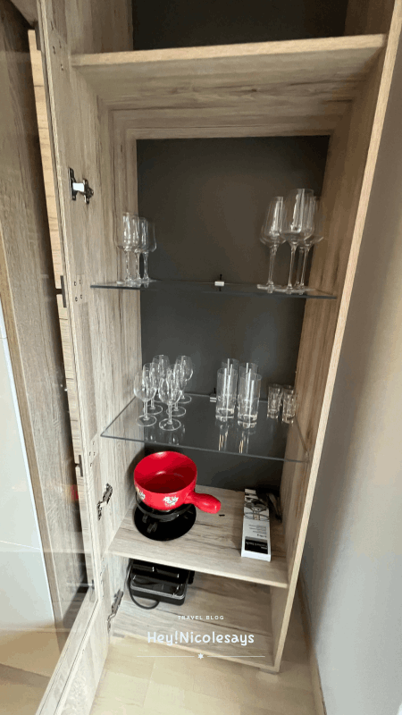 ▼ 在 Murphy Bed 的旁邊設有一個酒櫃,裡面除了備有酒杯之外,最吸引我們的是還放了一整套製作芝士火鍋的用具!看到之後我們立刻決定要好好利用它——於是第一天的晚餐,我們就在房間裡享受了自製的芝士火鍋,體驗非常有趣。