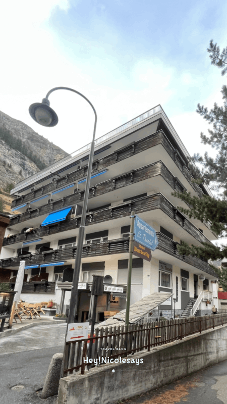 ▼ 策馬特小鎮雖然面積不大,但由於街道多為斜坡與石板路,拖著行李行走較為不便,因此我們選擇住宿時,特別優先考慮位於大街周邊、交通便利的住宿。這次入住的「Holliday Apartment Theodul Zermatt」位置極佳,距離策馬特火車站僅需步行不到5分鐘,無論是剛到達或離開時搬運行李,還是日常出行都非常方便,大大節省了時間與體力。