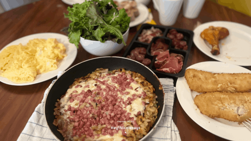 ▼ 開放式廚房與客廳之間擺放了一張大圓桌,空間足夠擺放我們準備的豐富食物。這兩天的早餐和晚餐,我們都在這個小廚房裡親自下廚。