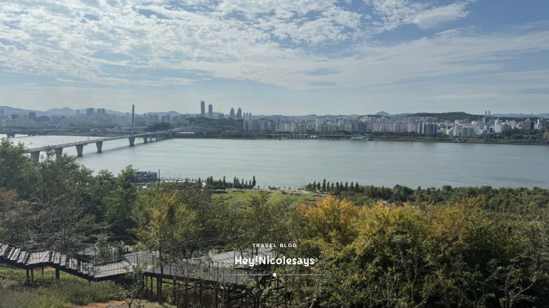 ▼ 我們在天空公園裡信步而行,沒有特定的路線,就這麼悠閒地走走停停。公園盡頭的觀景台,可以看到漢江與世界盃大橋的景色,視野很廣。此外,公園各處散落著幾個小食亭,供應著簡單的小吃與飲品,方便遊客隨時補充體力和休閒。