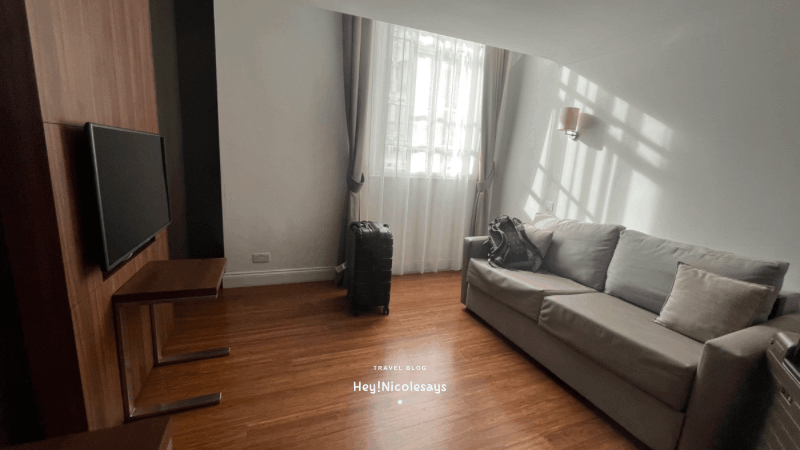 ▼ 酒店4人房間是樓中樓的設計,分兩層,有客廳、廚房、洗手間、睡房。客廳部分的梳化,晚上可以變成一張雙人折疊梳化床,足夠兩人睡。空間很足,不過折疊梳化床的床褥比較薄,有點太軟,幸好只是睡一個晚上還可以接受。