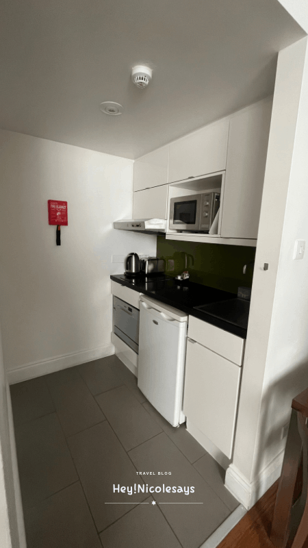 ▼ 廚房的部份有洗碗碟機、雪櫃、微波爐、熱水煲、多士機和各種餐具,很適合住在倫敦日子較長又想有廚房下廚的家庭。廚房整體的清潔度不錯,餐具等等都很乾淨整潔,只是我們留在房間的時間不多,翌日早上便出發到機場前往瑞士,實在沒有好好探索酒店的房間和設施。
