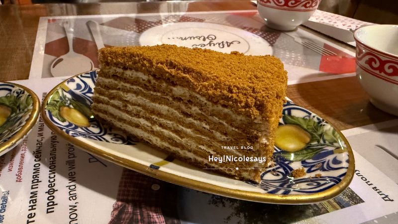 ▼ 蜂蜜蛋糕。它不是平常吃的那一種很絲滑的千層蛋糕蛋糕,不會太甜,但卻有濃濃的蜂蜜味道,不錯!我們光吃主菜已經吃得很飽,只點了一件蛋糕分享一起吃,份量剛剛好!