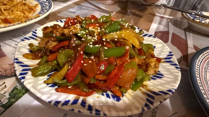 ▼ 蔬菜炒雞。這個蔬菜炒雞很有媽媽下廚的家裡味道,土耳其的三色椒很甜,來到這裡幾乎這一餐都吃了很多我平時不會主動吃的三色椒,加上雞肉炒得很好吃!讚!