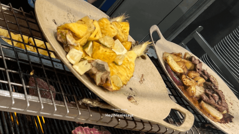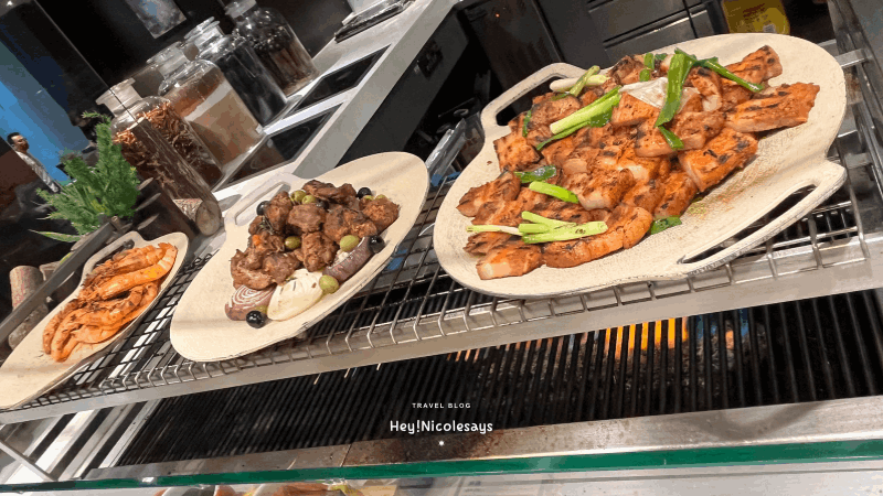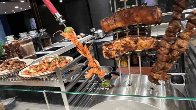 ▼ 燒烤區真的很有驚喜,也成為我最喜歡的類別!食物種類很多,有烤菠蘿、蝦、牛肉片、羊架、雞翼、烤蔬菜(青紅椒)等等。