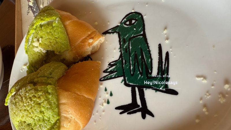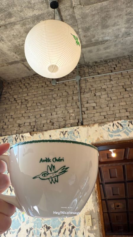 ▼ Avek Cheri的招牌上也印有一隻醒目的綠色小鳥。兩層樓高的咖啡店光是店門口就有好幾處適合拍照的打卡點,整體氛圍相當吸引。週六的早晨,這間人氣咖啡廳的客人意外不多,不用排隊就能直接入座,悠閒地享受早餐時光。