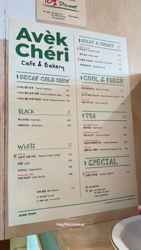 在首爾延南洞的巷弄有不少特色的咖啡店,這天早上我們來到延南洞的「Avek Cheri」(아벡쉐리),在我們的Airbnb走過來5分鐘左右便到達,這間店的特色在超多款式的鹽麵包口味,其中以「蜜瓜鹽麵包和鮮奶油鹽麵包」而聞名的咖啡廳。牆上那隻俏皮的綠色小鳥正是Avek Cheri的標誌性的LOGO很容易認。