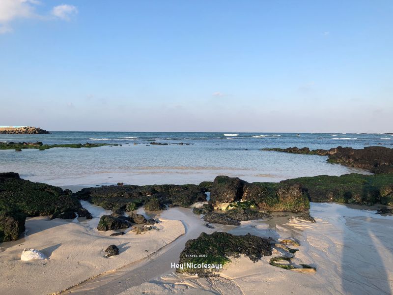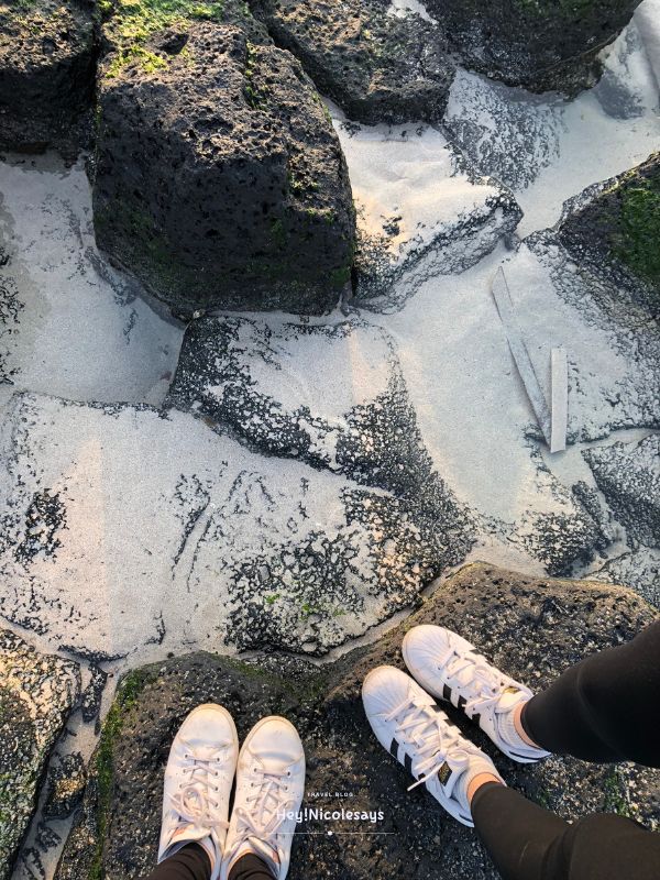 ▼ 海灘潮退時有些石頭外露,我們都有慢慢走上去拍照,不過拍照時要小心,石頭上的青台都有點滑,打卡留念也要小心跌倒!