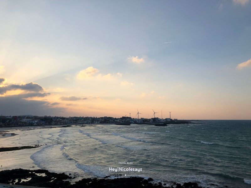 ▼ 逛完海灘,就慢慢沿著海灘一直走,去一間手信店”濟州海洋蠟燭手信 월정스캔들“,步行到中途回頭看,這個夕陽配上一望無際的大海,美得很驚人😍