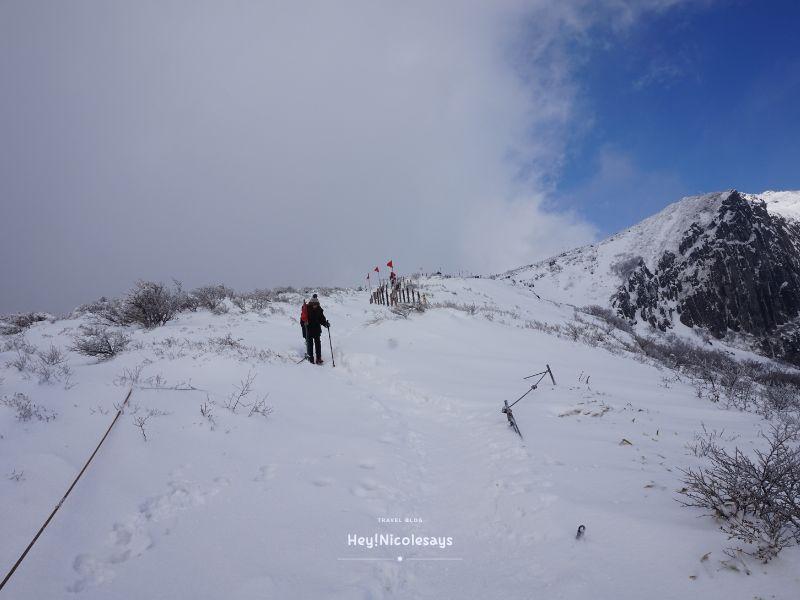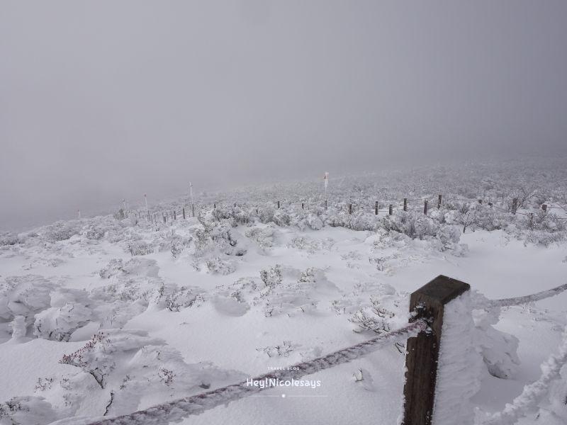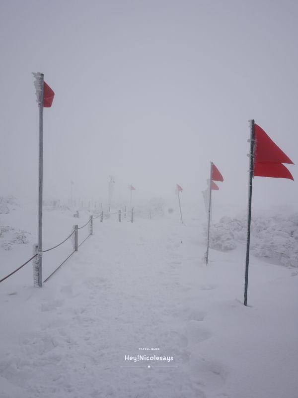 ▼ 再說一次,走漢拿山有一點要記住,就是不能偏離圍欄/紅色旗。因為山上積雪真的很厚,憑肉眼是不能分別究竟雪的底部是行人路還是空心,萬一踩空就麻煩!而且四周雪濛濛,偏離路線也很容易會迷失方向。