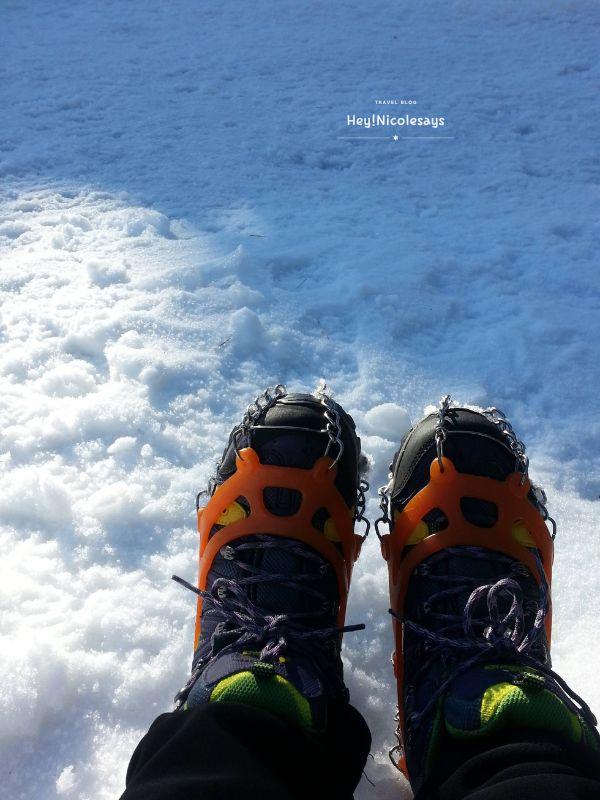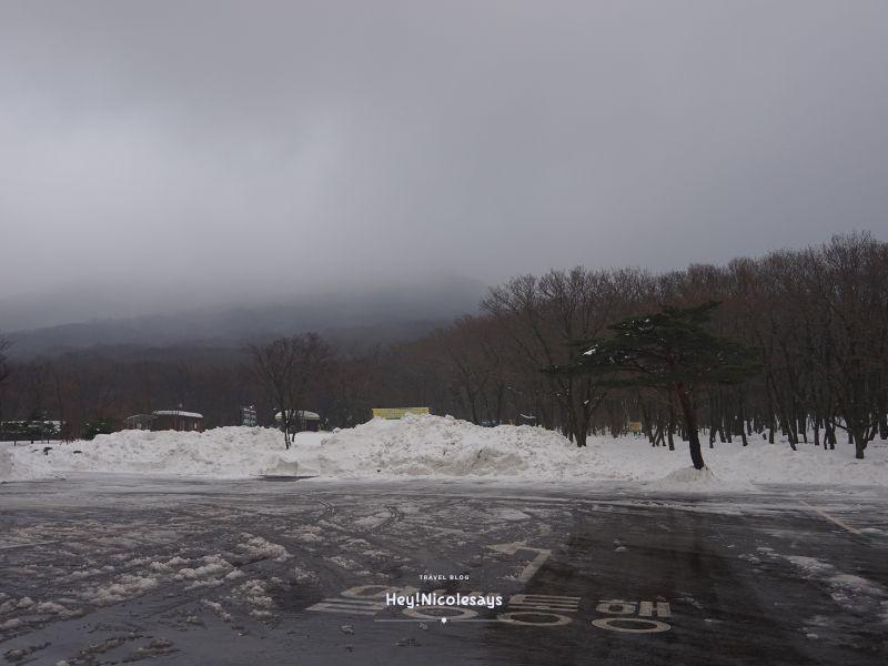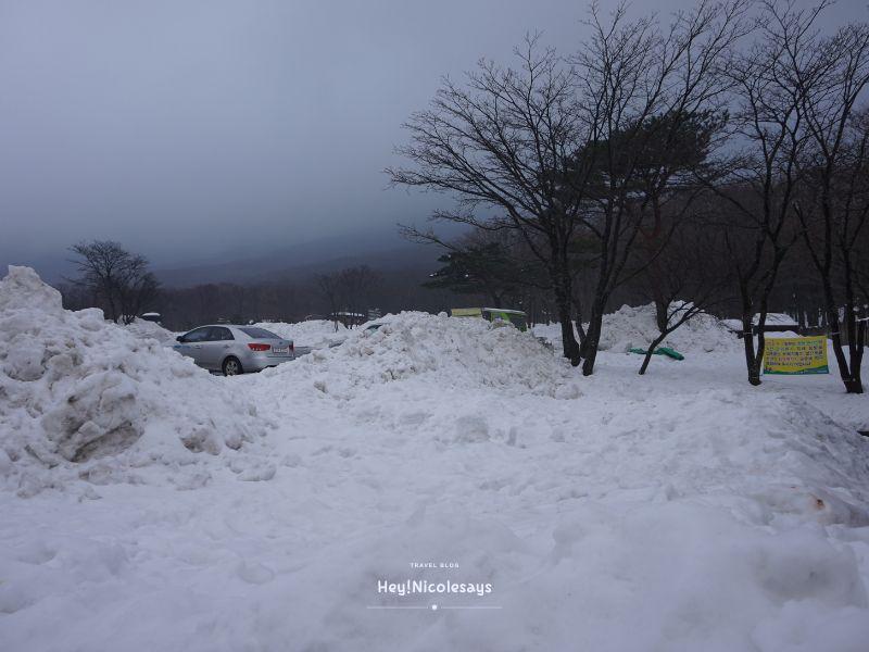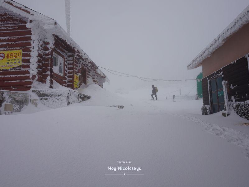 ▼ 我們由濟州島中文區出發,乘坐的士一路往山上走的時候,心情慢慢變緊張,由於時間很早,沿路沒有其他車,只有愈來愈厚的積雪。去到登山入口前的旅客中心,亦因時間太早未開門,我們就在旁邊的更衣室換上裝備,檢查好行山鞋、雪釘、帶上能量棒、食物、暖水等等就準備出發了!
