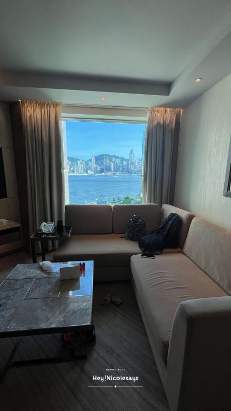 ▼ 這間客房主要分為兩個區域:主廳和卧室。進入房間時,亮點必定是主廳的L型巨型梳化,搭配窗外無敵的維港美景,讓人非常興奮。入住當日陽光普照,加上藍天白雲,坐在梳化上,欣賞著維港的壯麗景色,真的是一大享受!