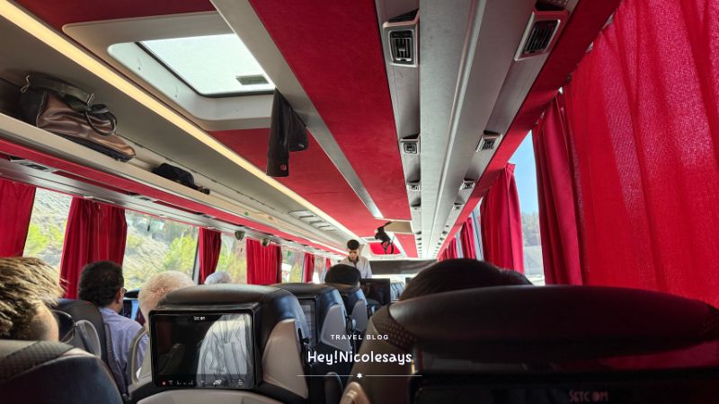 ▼ 巴士的車型很新,而且保養得宜,巴士的質素令我們喜出望外。內部的座位非常寬闊,比起飛機的座位還要舒適。3個多小時的車程,還有一位服務員,沿途會提供飲品(有熱茶、可樂、橙汁等等等)和一些零食。這個新穎的巴士體驗對我們來說,真的很特別!