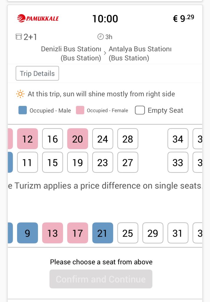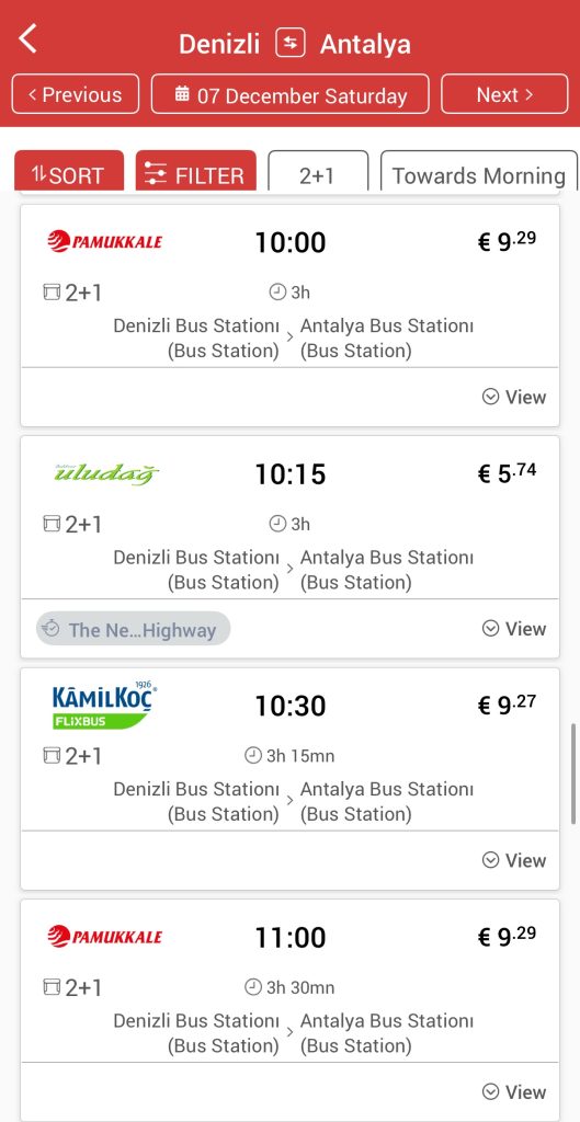 ▼ 接著會看到不同巴士公司營運的班次,其中KamilKoc和Pamukkale的車隊在土耳其是最大規模和車型會比較新,不少旅客都會選擇這兩間大規模的巴士公司。